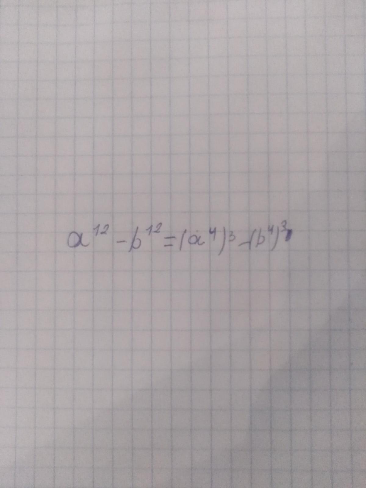 a^{12}-b^{12}=(a^4)^3-(b^4)^3=(a^4-b^4)(a^8+a^4b^4+b^8)=\\\\=(a^2-b^2)(a^2+b^2)(a^8+a^4b^4+b^8)=\\\\=(a-b)(a+b)(a^2+b^2)(a^8+a^4b^4+b^8)=