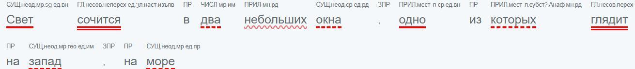 Синтаксический разбор предложения- "свет сочится в два небольших окна, одно из которых глядит на запад, на море"