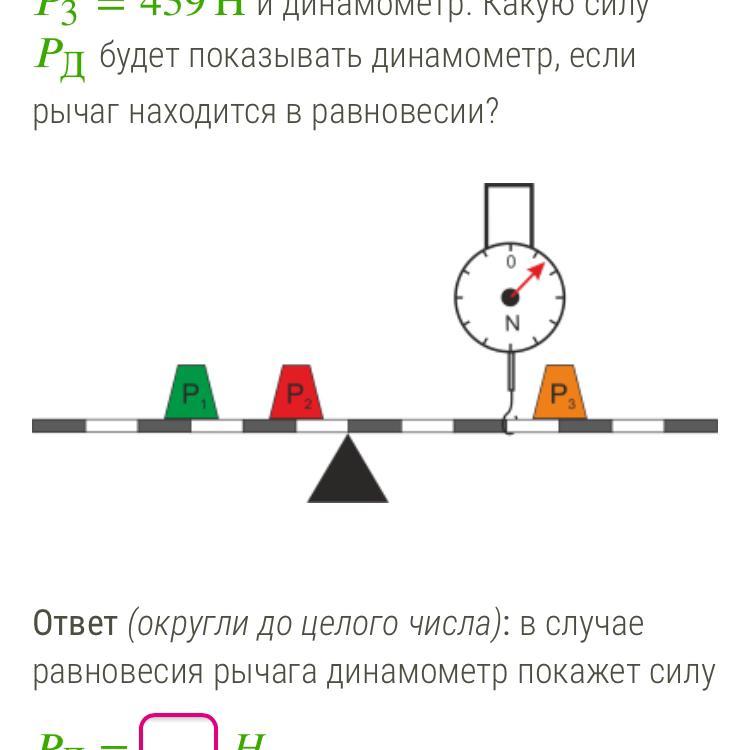 Дан невесомый рычаг, на одной стороне которого находятся два противовеса, их вес равен Р1 = 69 Н и Р2 = 85 Н. На второй стороне рычага находится противовес Р3 = 439 Н и динамометр. Какую силу будет показывать динамометр, если