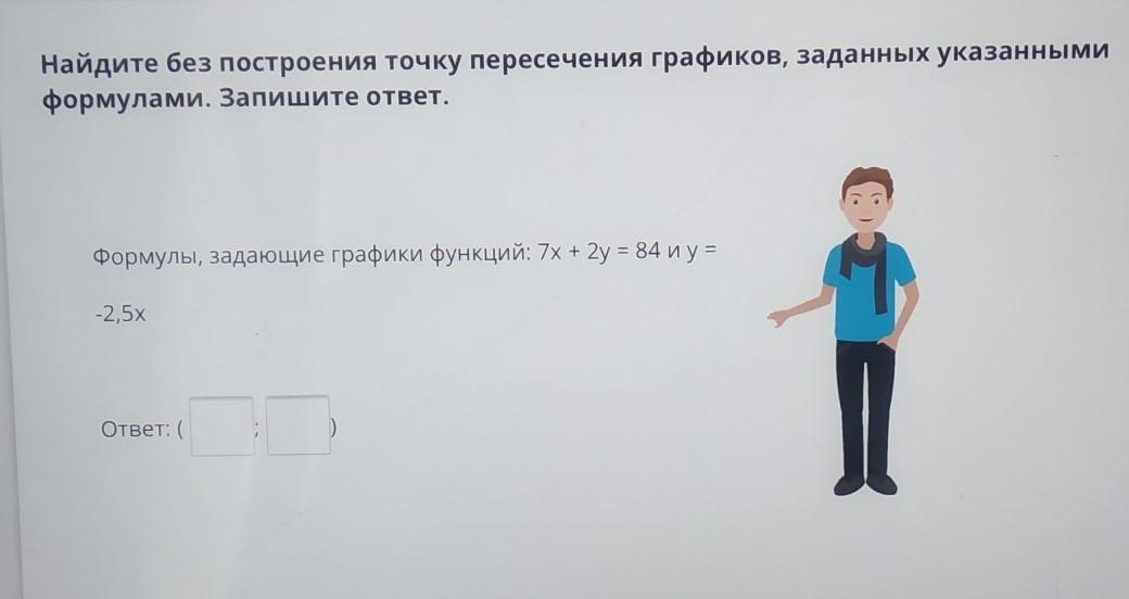 найдите без построения точку пересечения графиков заданных указанными формулами. запишите ответ. 15 баллов алгебра 7 класс.