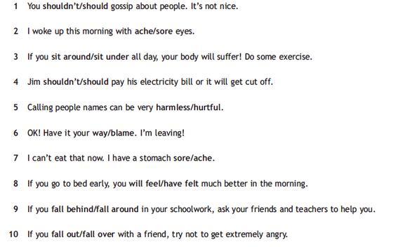 shouldn't,sore, around, should, hurtful,way,ache, will feel, fall behind,fall out.