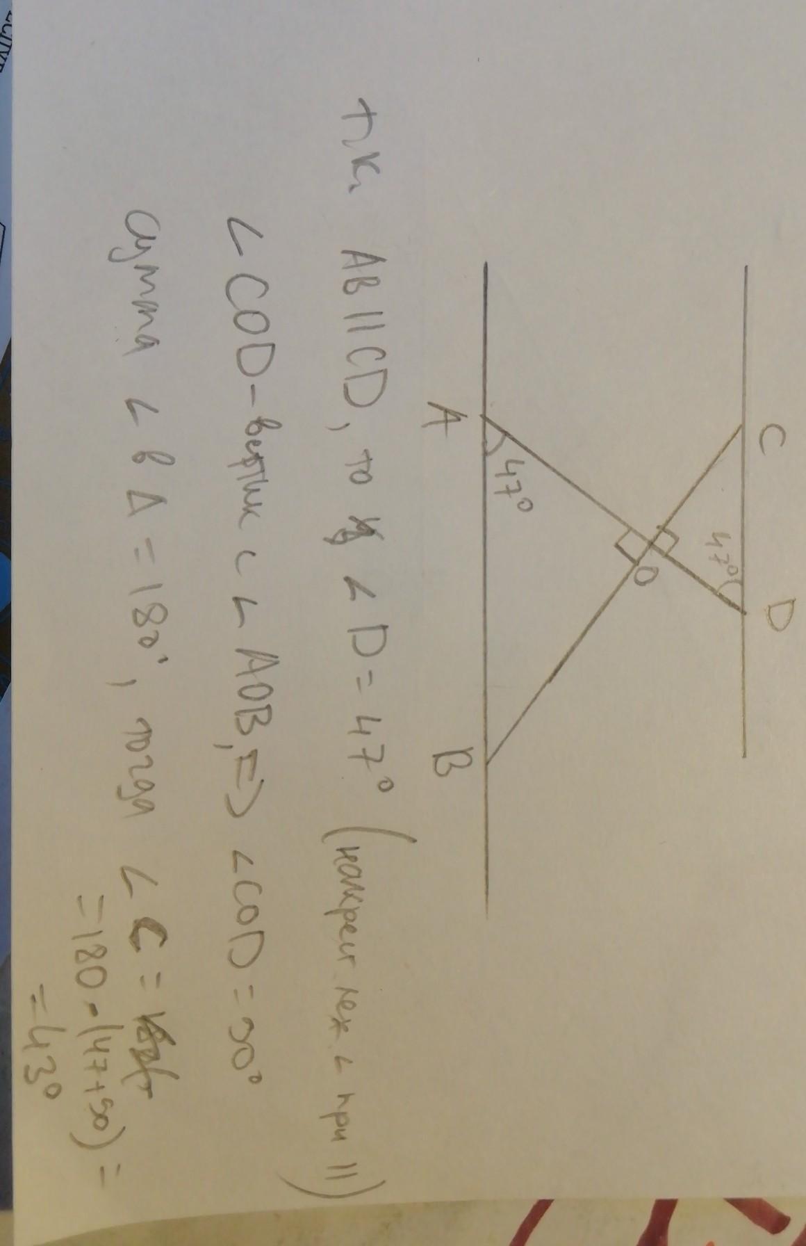 CDO = 47 градусов, т.к.OAB и CDO накрест лежащие углы