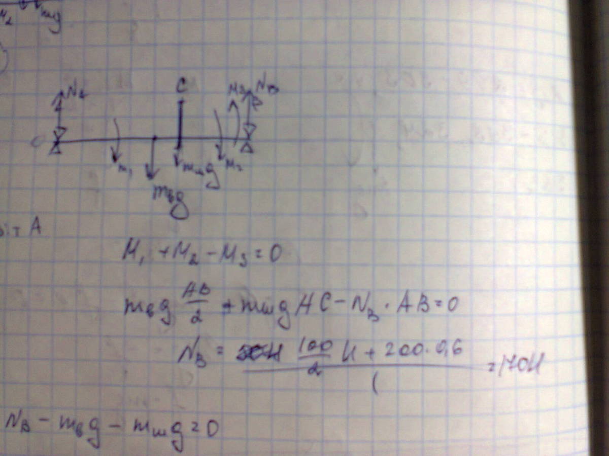 Чему равны силы, действующие на подшипники А и В (рис. 55), если масса вала 10 кг, масса шкива 20кг, |ЛВ|=1 м. ВС=0,4 м