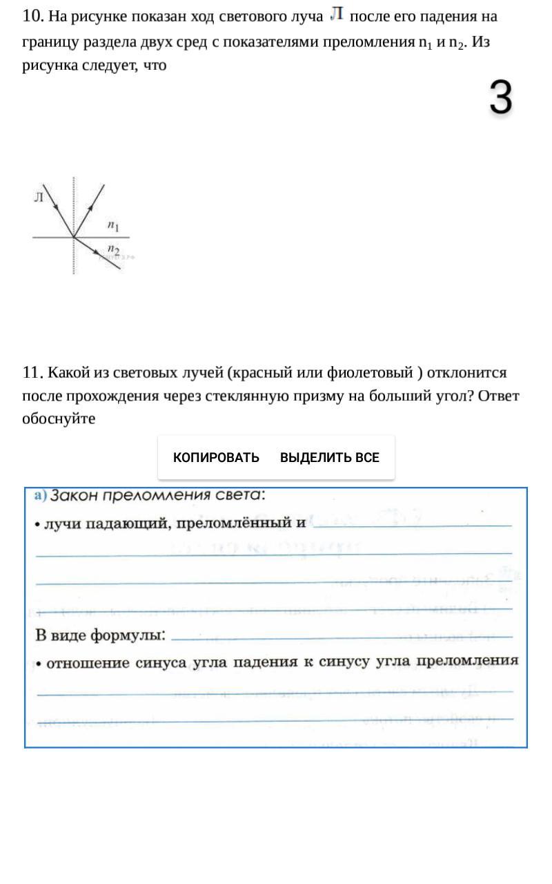 10. На рисунке показан ход светового луча после его падения на границу раздела двух сред с показателями преломления n1 и n2. Из рисунка следует, что