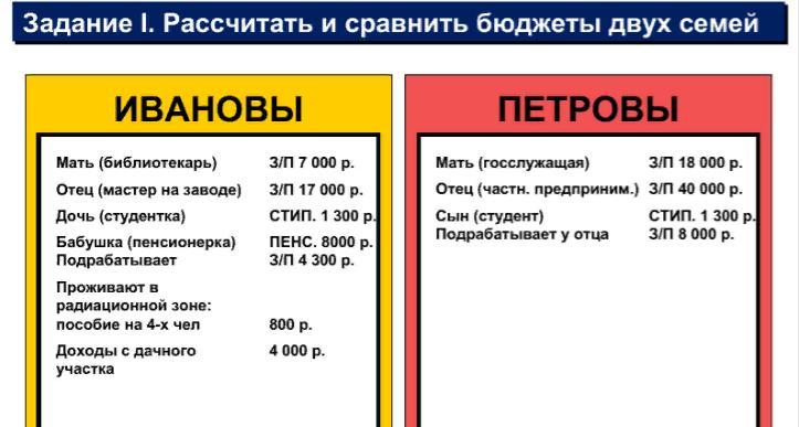 1. Рассчитать и сравнить бюджеты двух семей ИВАНОВЫ ПЕТРОВЫ Мать (библиотекарь) З/П 7 000 р. Мать (госслужащая) Отец (мастер на заводе) З/П 17 000 р. Отец (частн. предприним. ) З/П 40 000 р. Дочь (студентка) СТИП. 1 300 р. Бабушка (пенсионерка) Подрабатывает ПЕНС. 8000 р. З/П 4 300 р. Сын (студент) Подрабатывает у отца Проживают в радиационной зоне: пособие на 4 -х чел 800 р. Доходы с дачного участка 4 000 р. З/П 18 000 р. СТИП. 1 300 р. З/П 8 000 р.