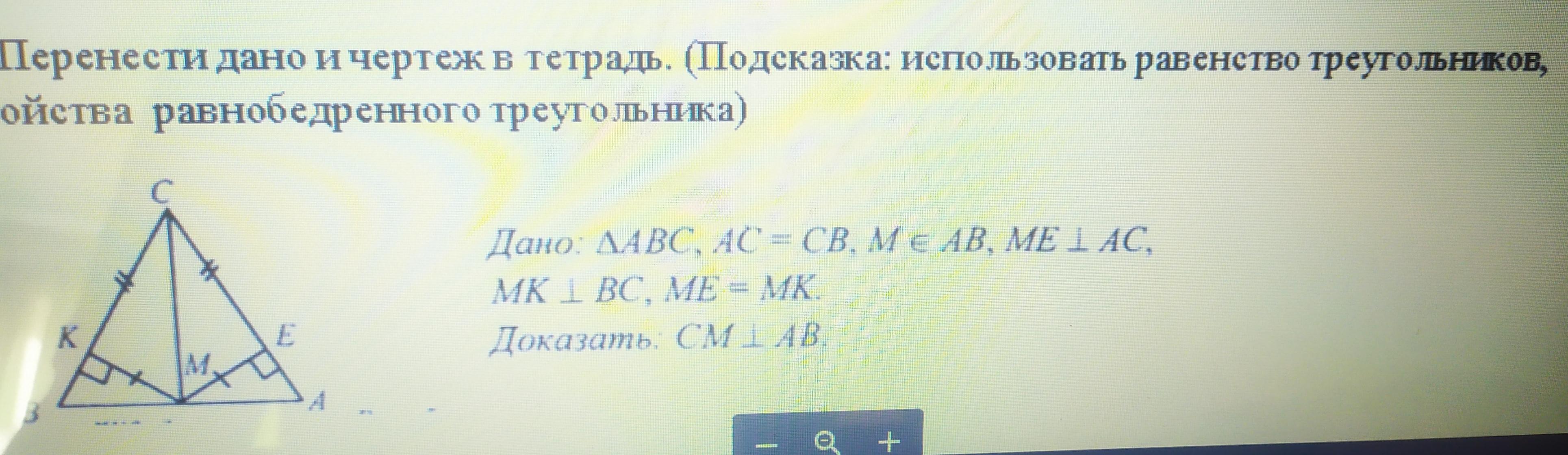 Дано:∆АВС, АС=СВ, МэАВ, МЕ перпендикулярно АС, МК перпендикулярно ВС, МЕ=МК.