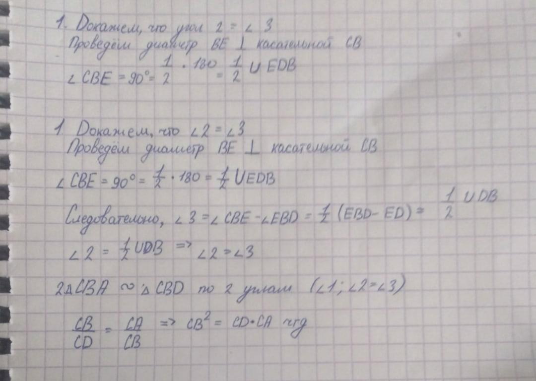 1) докажи, что ∡2=∡3 (проведи диаметр окружности от точки B перпендикулярно касательной и используй формулу градусной меры вписанных углов).