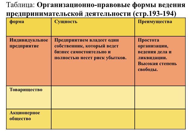 Помогите заполнить таблицу «Организационно-правовые формы ведения предпринимательской деятельности»