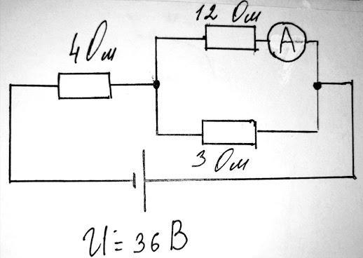 Что показывает амперметр A в цепи, схема которой приведена на рисунке?
