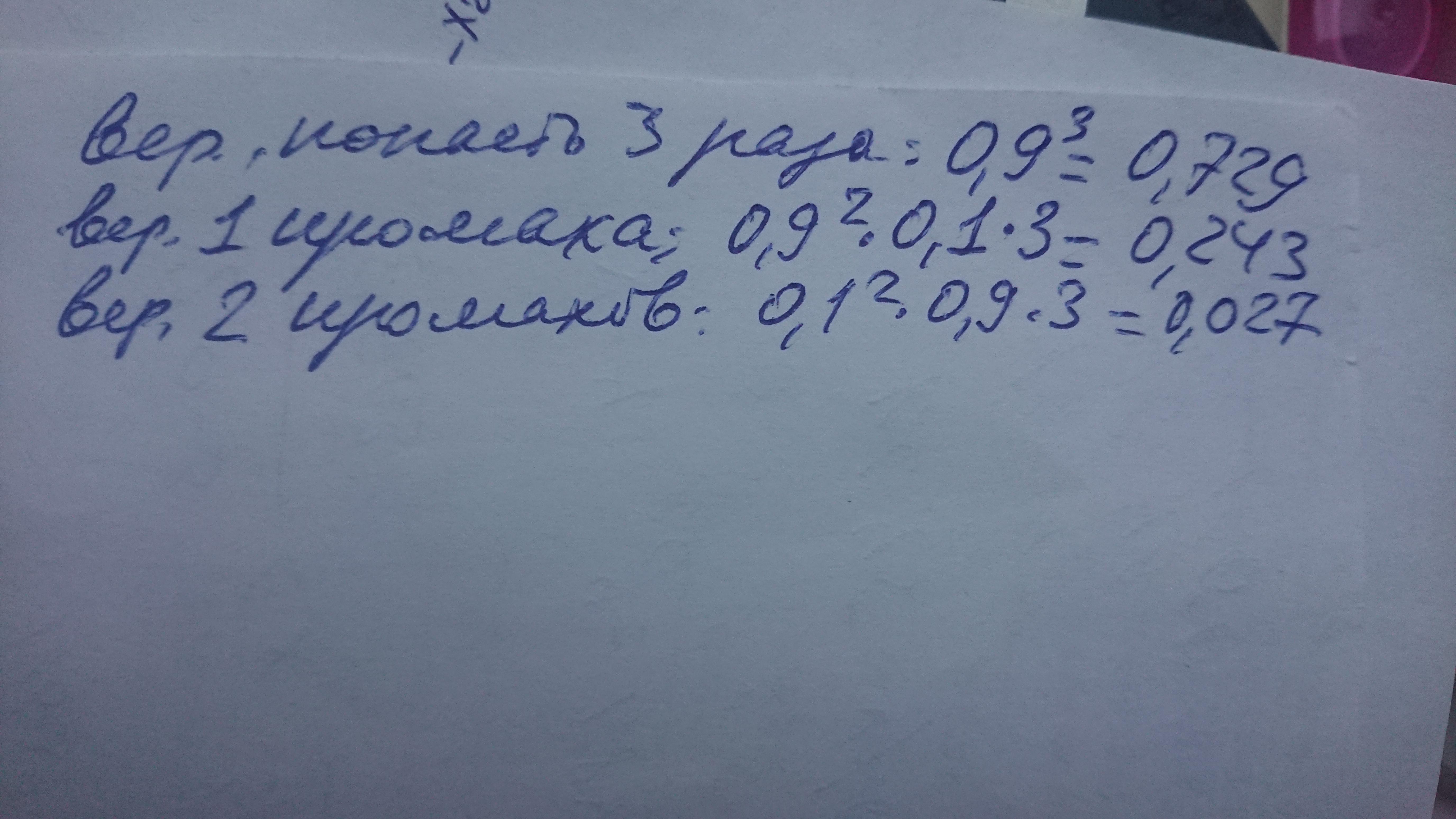 Стрелок стреляет в мишень 3 раза. Вероятность попадания при каждом выстреле 0,9. Найдите закономерность попадания в мишень.
