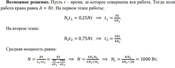 При подъёме груза кран работал в два этапа. Сначала он совершил четверть всей работы, развивая некоторую мощность N1, а затем оставшуюся работу совершил, развивая мощность N2 = 2000 Вт. Оказалось, что средняя мощность подъёмного крана за время совершения всей работы равна N = 1600 Вт. Найдите мощность N1.