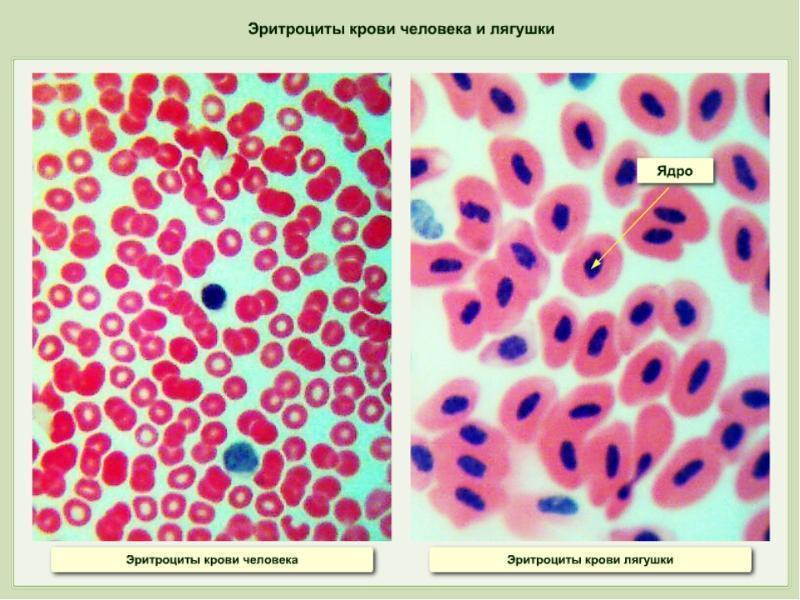 - Эритроциты человека двояковогнутые, а у лягушки двояковыпуклые. Это тоже увеличивает количество переносимого кислорода