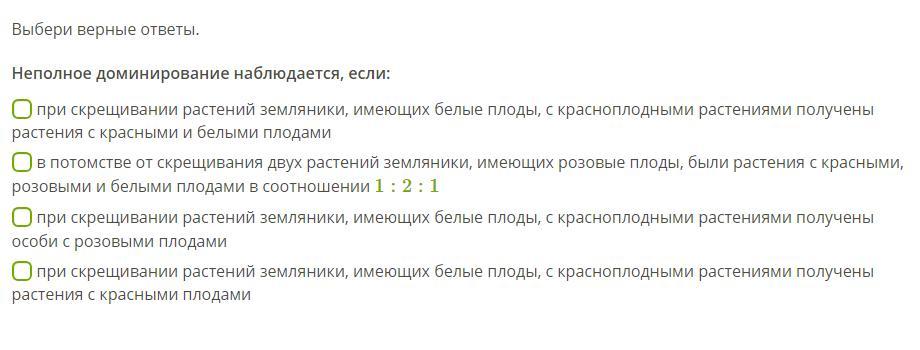 1. Неполное доминирование наблюдается, если 2) в потомстве от скрещивания двух растений ... 1:2:1 ; и 3) при скрещивании растений земляники ... получены особи с розовыми плодами.