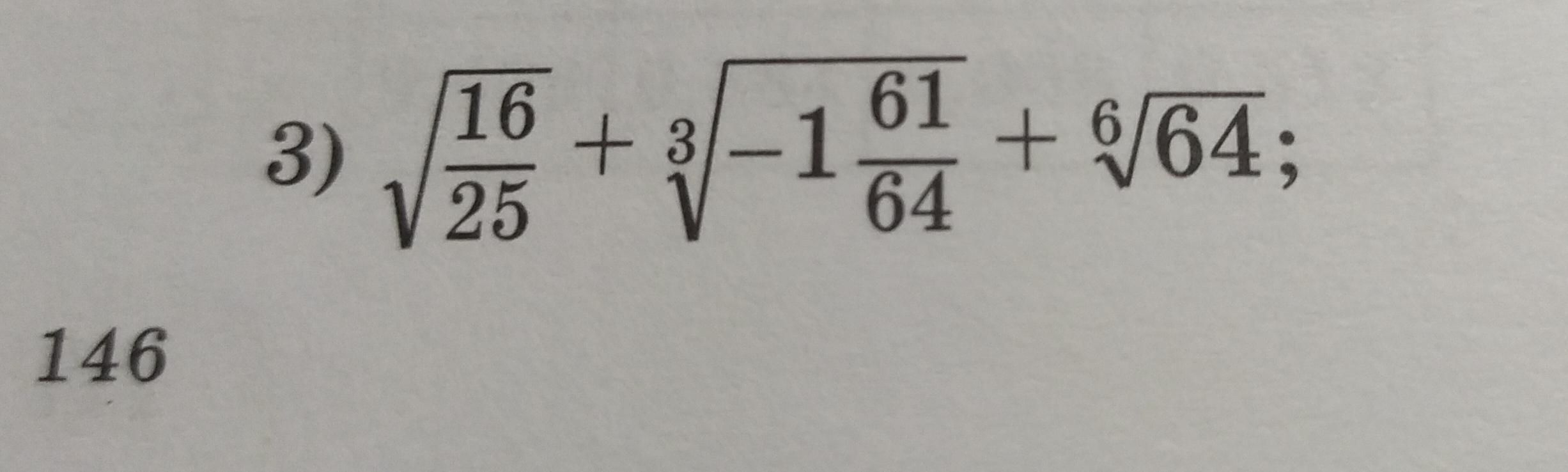 \sqrt{ \frac{16}{25} }  +  \sqrt[3]{ - 1 \frac{61}{64} }  +   \sqrt[6]{64}  =  \sqrt{ \frac{4 {}^{2} }{ {5}^{2} } }  +  \sqrt[3]{ -  \frac{125}{64} }  +  \sqrt[6]{2 {}^{6} }  =  \frac{4}{5}   -  \sqrt[3]{   \frac{5 {}^{3} }{4 {}^{3} } }  + 2 = 2 \frac{4}{5}  -  \frac{5}{4}  = 2.8 - 1.25 = 1.55