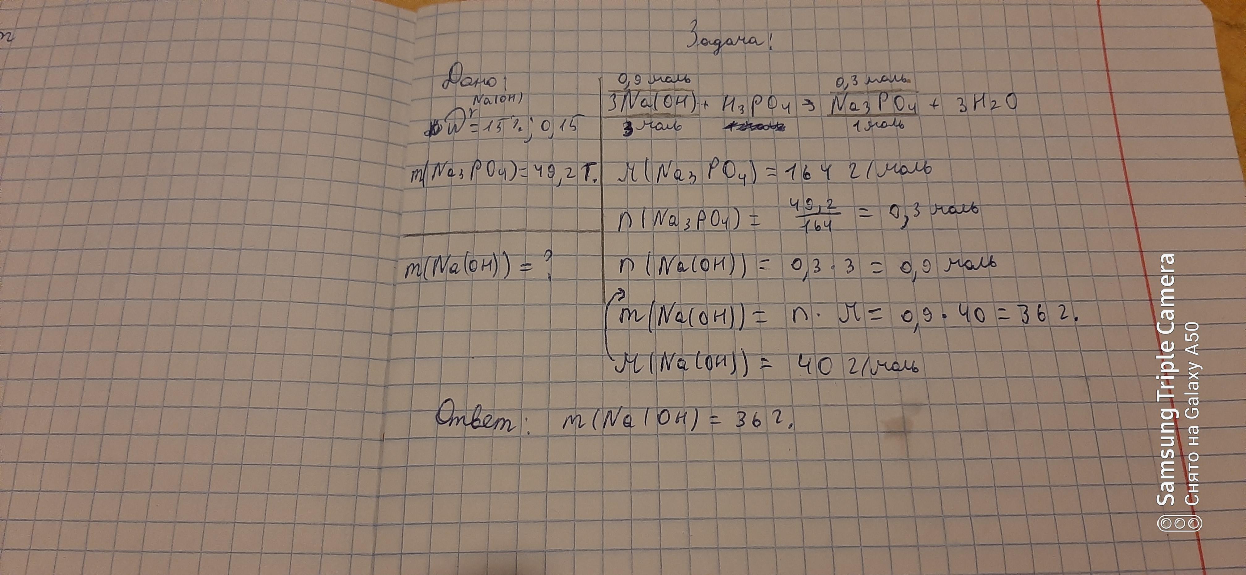 При взаимодействии 15% раствора гидроксида натрия с фосфорной кислотой получили соль массой 49,2г. Рассчитайте массу 15% раствора щелочи, вступившей реакцию.