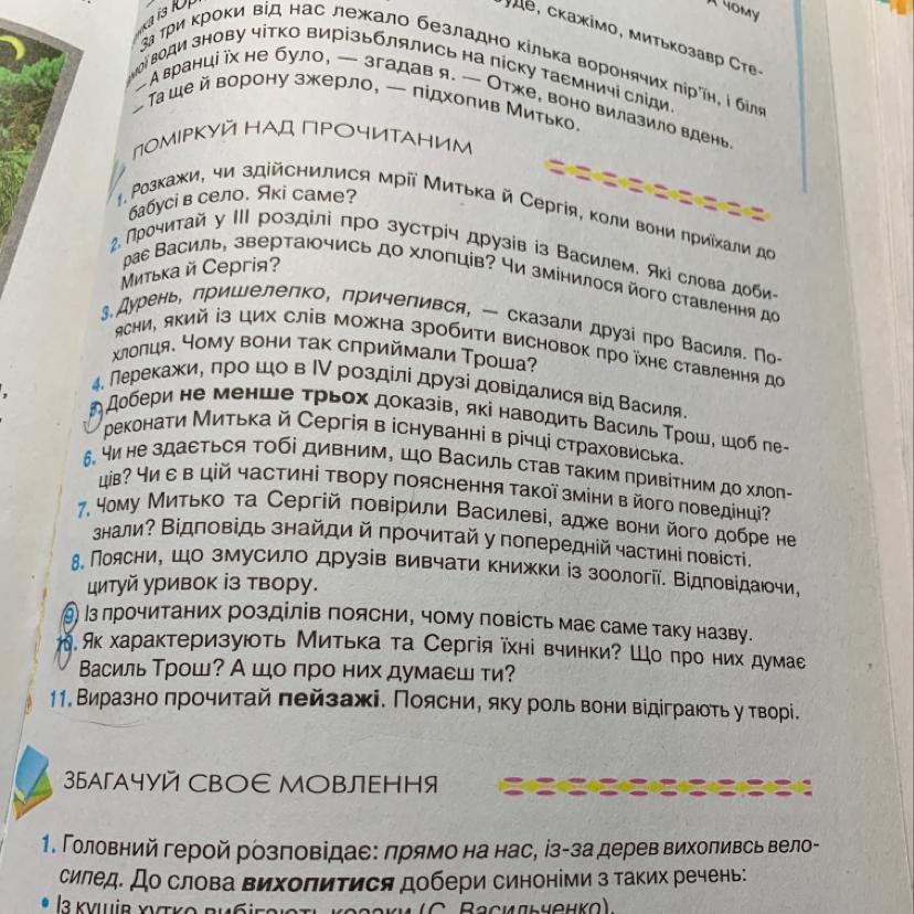 Ответ: Митько і Сергій дуже працьовиті й дотепні хлопці, вони ніколи не кинуть в біді. Василь спочатку думав, що хлопці дуже боягузливі, він зовсім не поважав їх, но коли вони його спасли, його думка змінилася.