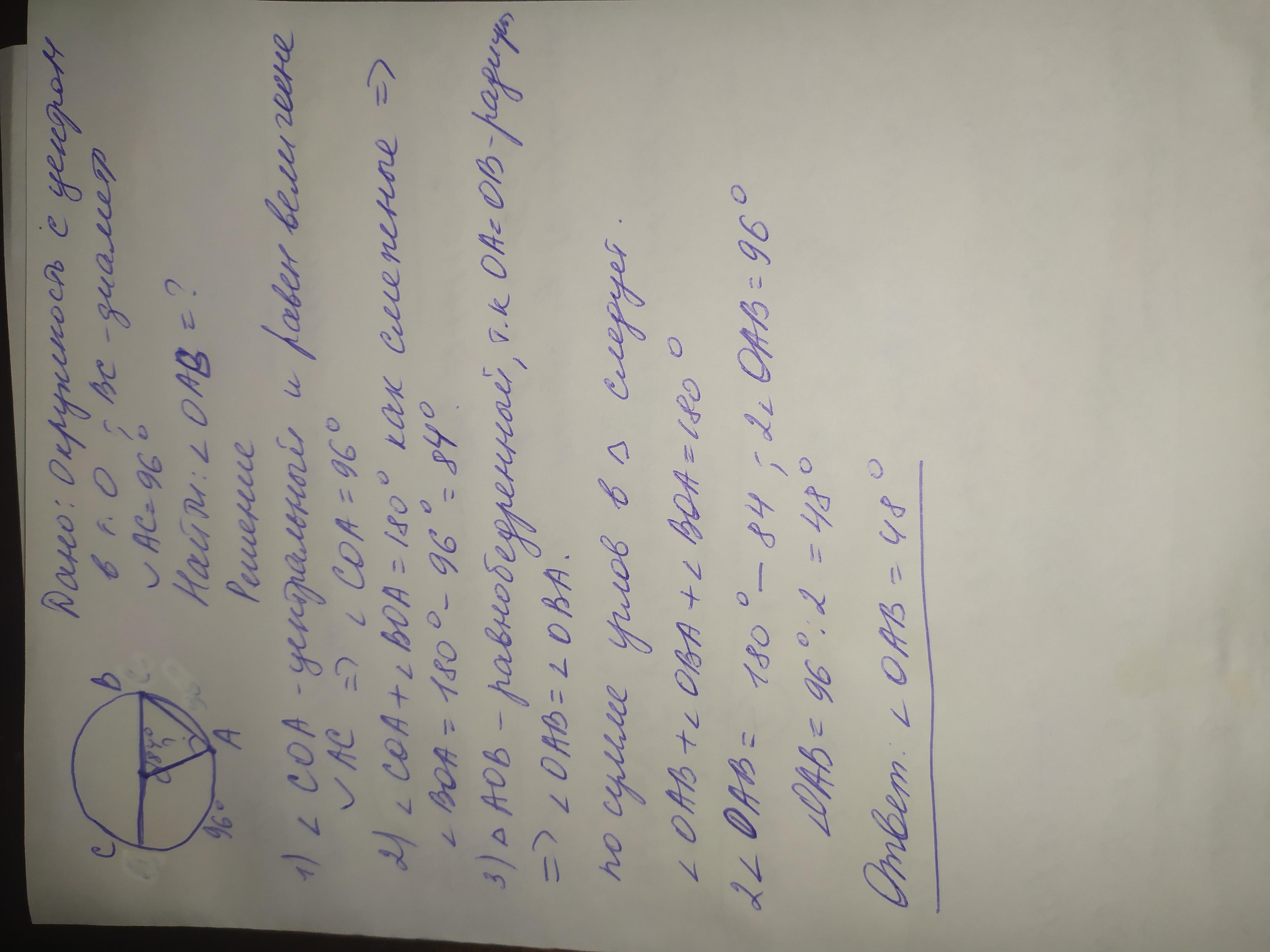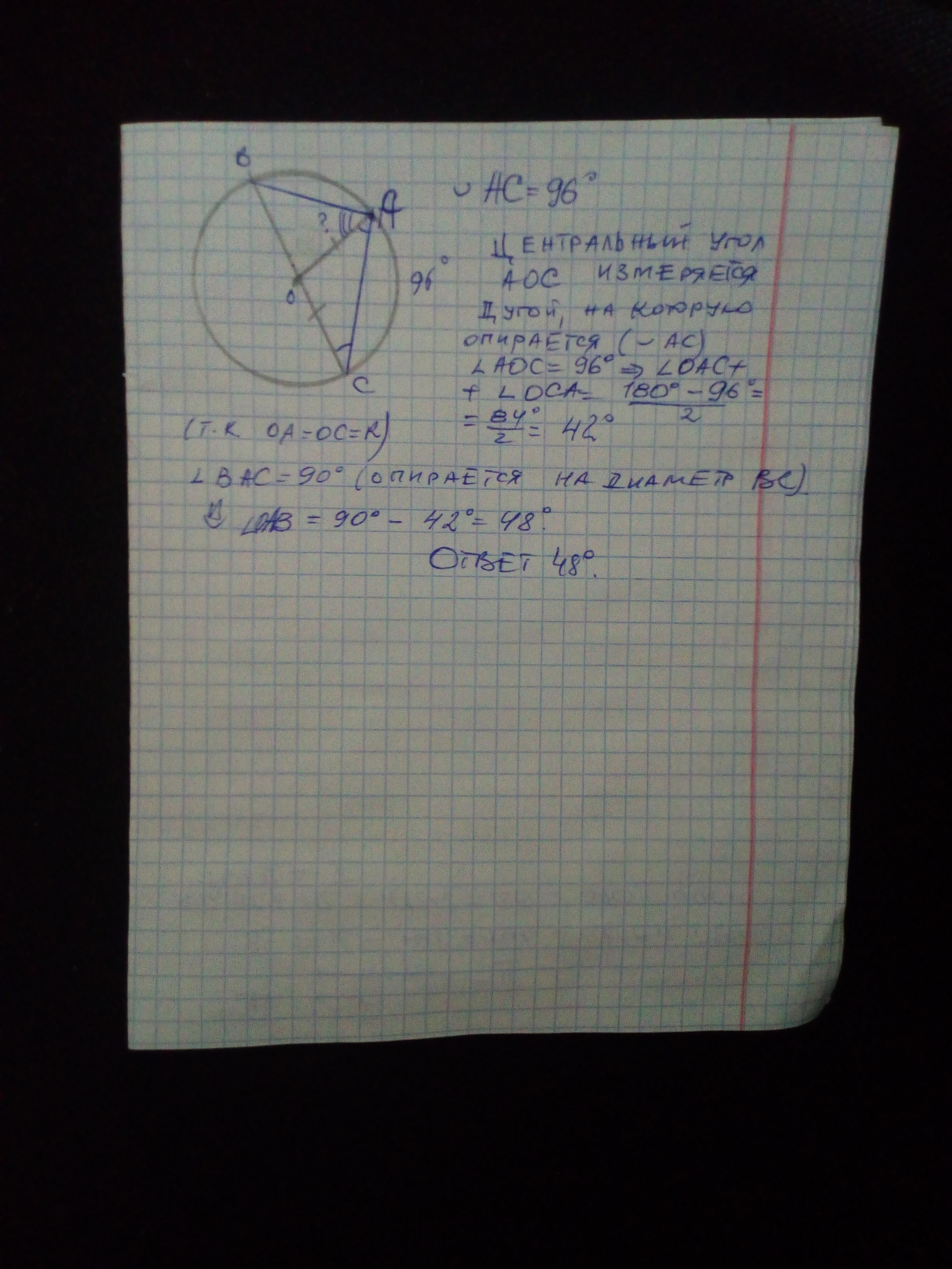 Отрезок BC является диаметром окружности с центром в точке О. Точка А лежит на окружности так, что дуга AC= 96°. Найдите градусную меру ∠ОAB.