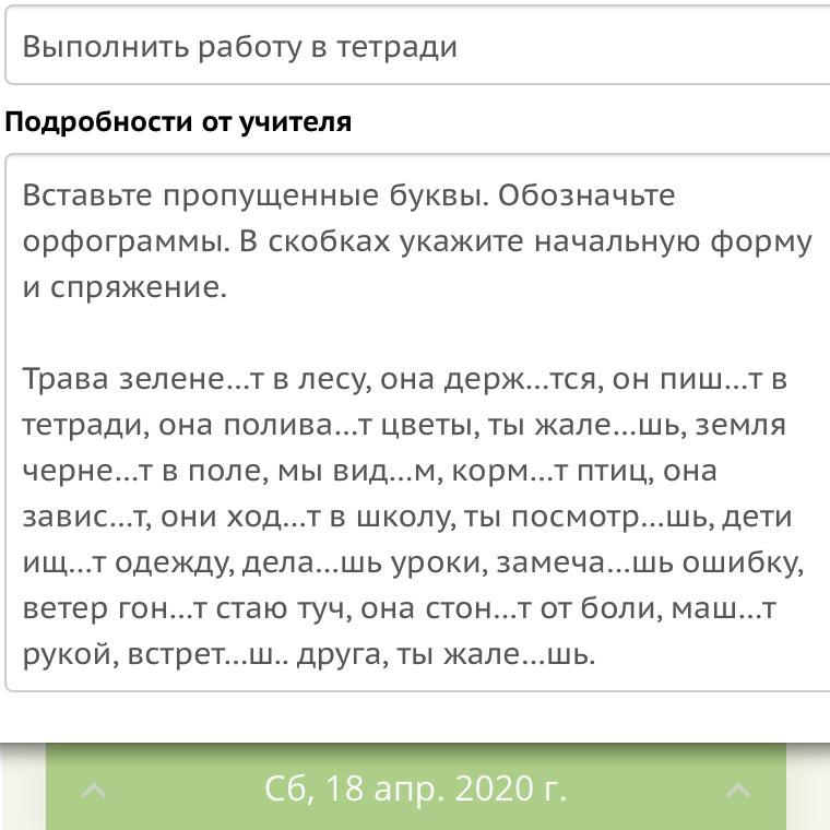 Трава зеленеет(зеленеть-1спр) в лесу,она держится(держаться-2спр),он пишет(писать-1спр) в тетради, она поливает(поливать-1 спр) цветы, ты жалеешь(жалеть-1спр), земля чернеет(чернеть-1спр) в поле, мы видим(видеть-2спр),кормит(кормить-2спр) птиц, она зависит(зависеть-искл, 2спр),они ходят(ходить-2спр) в школу, ты посмотришь(посмотреть-2спр),дети ищут(искать-1спр) одежду, делаешь(делать-1спр) уроки, замечаешь(замечать-1спр) ошибку, ветер гонит(гнать-искл, 2спр) стаю туч, она стонет(стонать-1спр) от боли, машет(махать-1спр) рукой, встретишь(встречать-2спр) друга, ты жалеешь(жалеть-1спр).