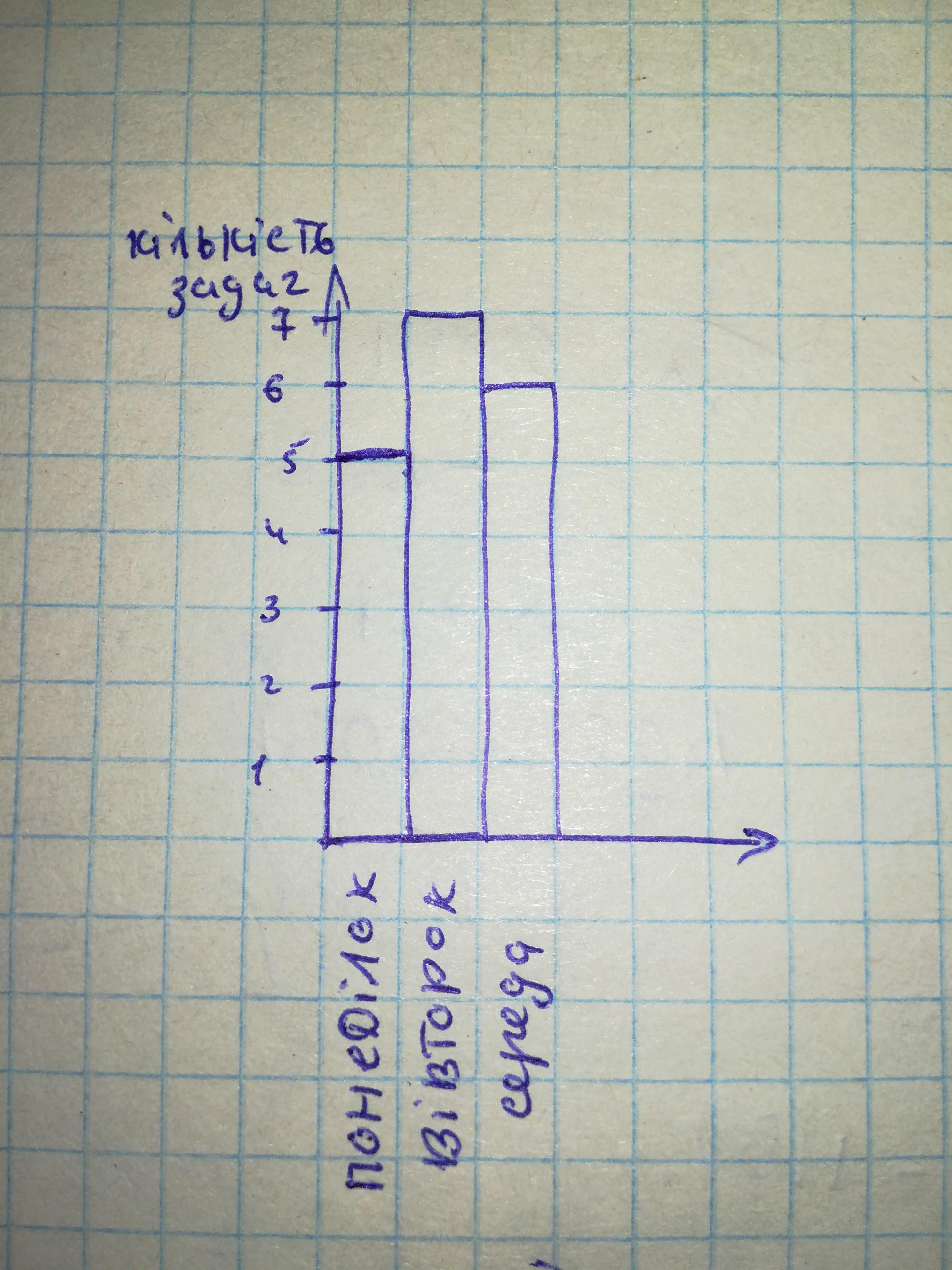 Під час канікул Марічка розв’язувала задачі з комбінаторики: у понеділок - 5 задач, у вівторок - 7 задач, а в середу - 6 задач. Побудуйте гістограму кількості задач, що розв’язувала Марічка протягом цих трьох днів.