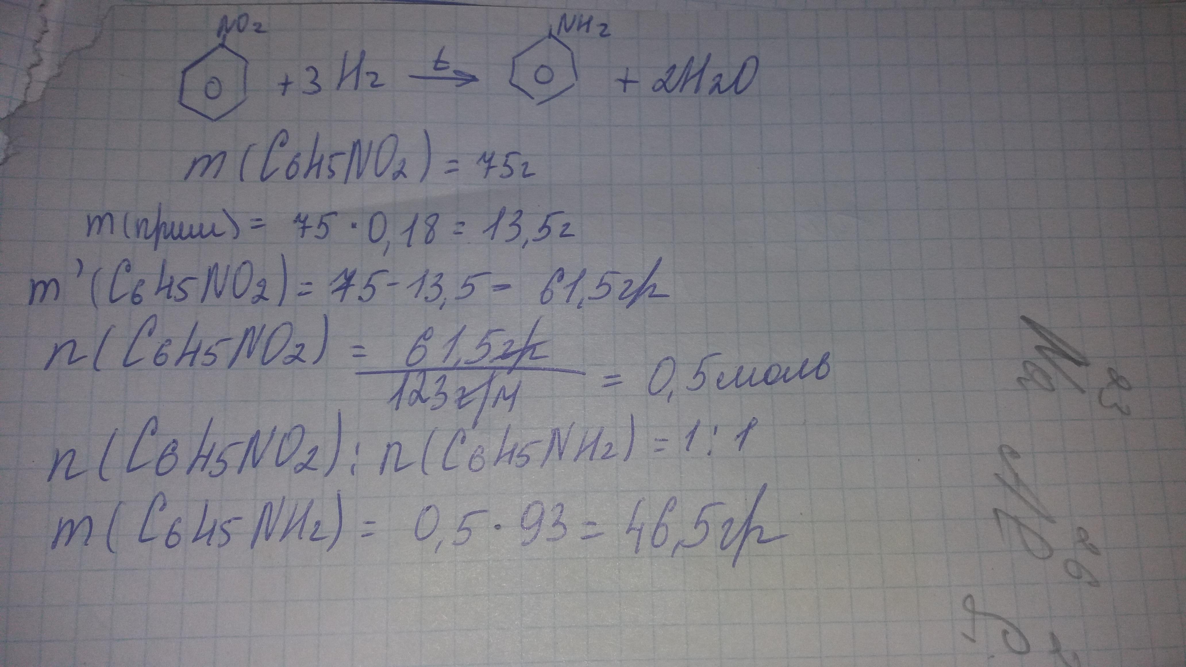 Вычислите массу анилина, что можно получить по техническому нитробензола массой 75г с массовой долей примесей 18%.