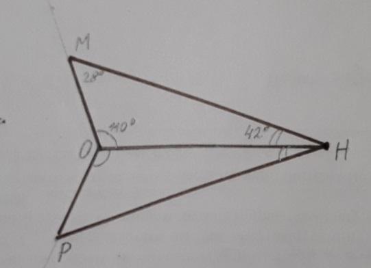 2) ˂МНО = 42⁰, ˂ НМО = 28⁰, ˂ НОМ = 110⁰.