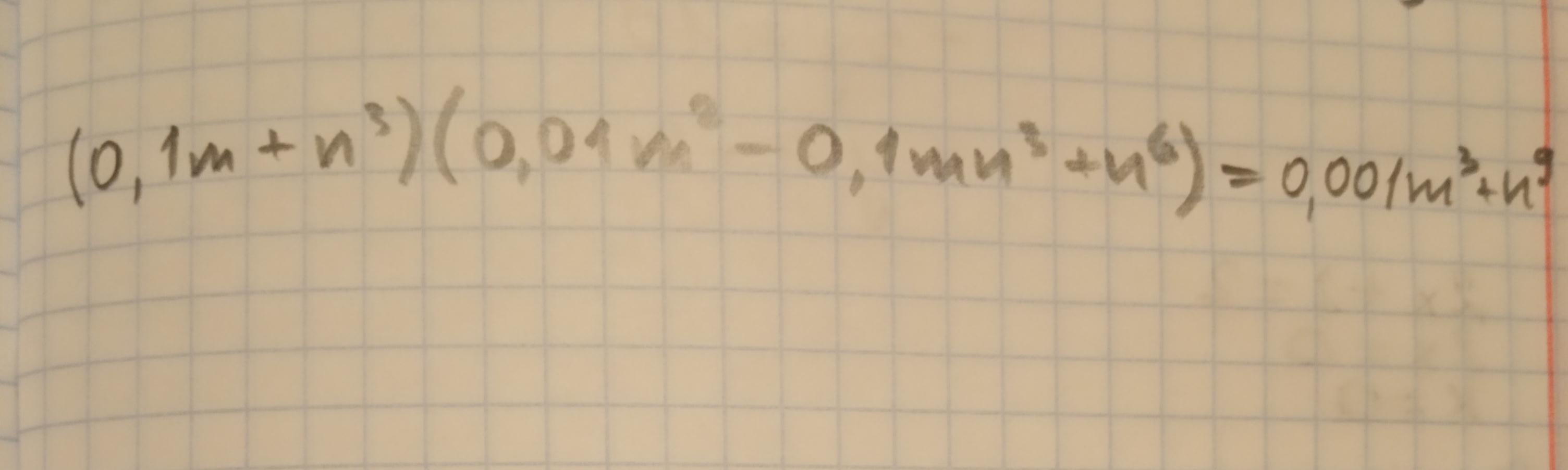 0,1m•0,01m^2-0,1m•0,1mn^3+0,1m•n^6+n^3•0,01m^2-n^3•0,1mn^3+n^3•n^6=0,001m^3-0,01m^2n^3+0,1mn^6+0,01n^3m^2-0,1mn^6+n^9=0,001m^3-n^9
