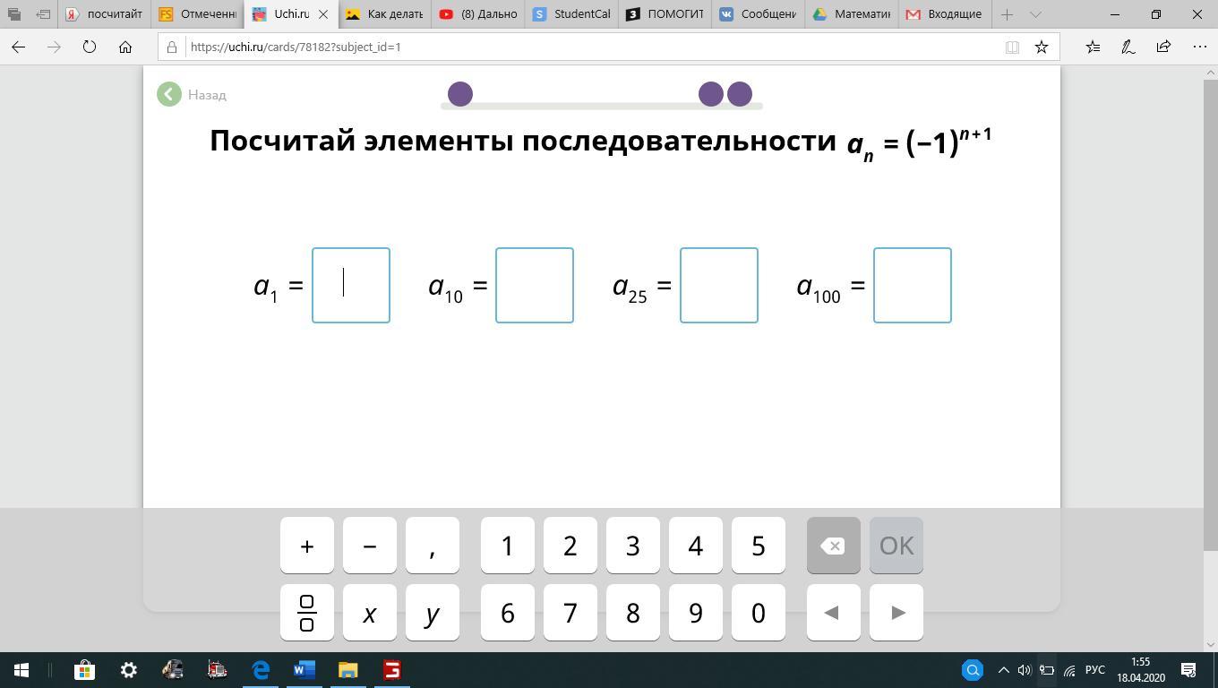 Если догадаться, то любое нечётное n будет давать положительный результат, а любое чётное n - отрицательный.