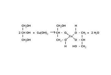 При взаимодействии гидроксида меди (II) с глицерином и другими многоатомными спиртами в присутствии щелочи происходит растворение гидроксида и образуется комплексное соединение синего цвета. Эта реакция используется для обнаружения многоатомных спиртов.