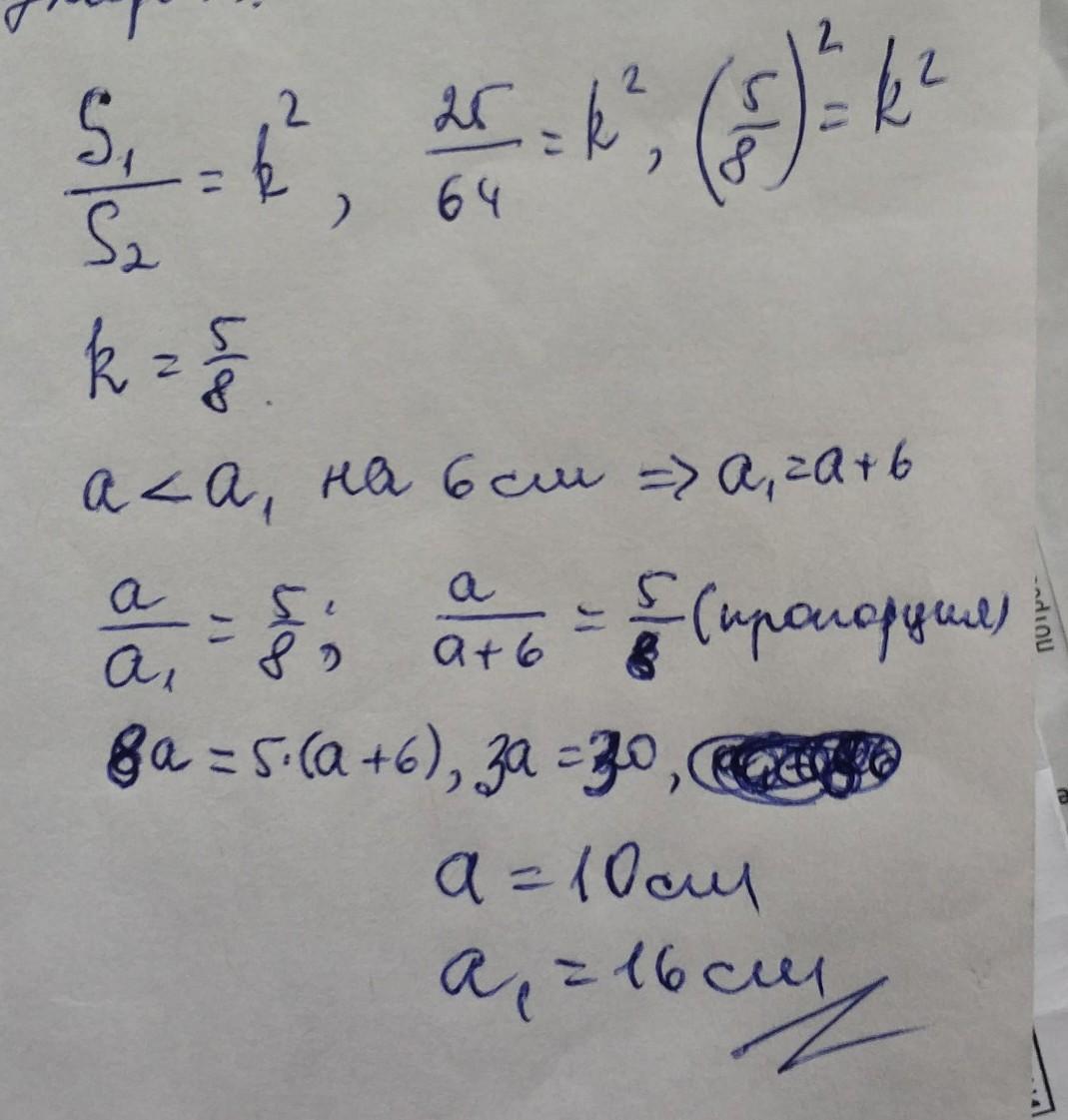 площі двох подібних трикутників 25 см2 і 64 см2. знайти відповідні сторони цих трикутників якщо одна з них на 6 см довша за іншу