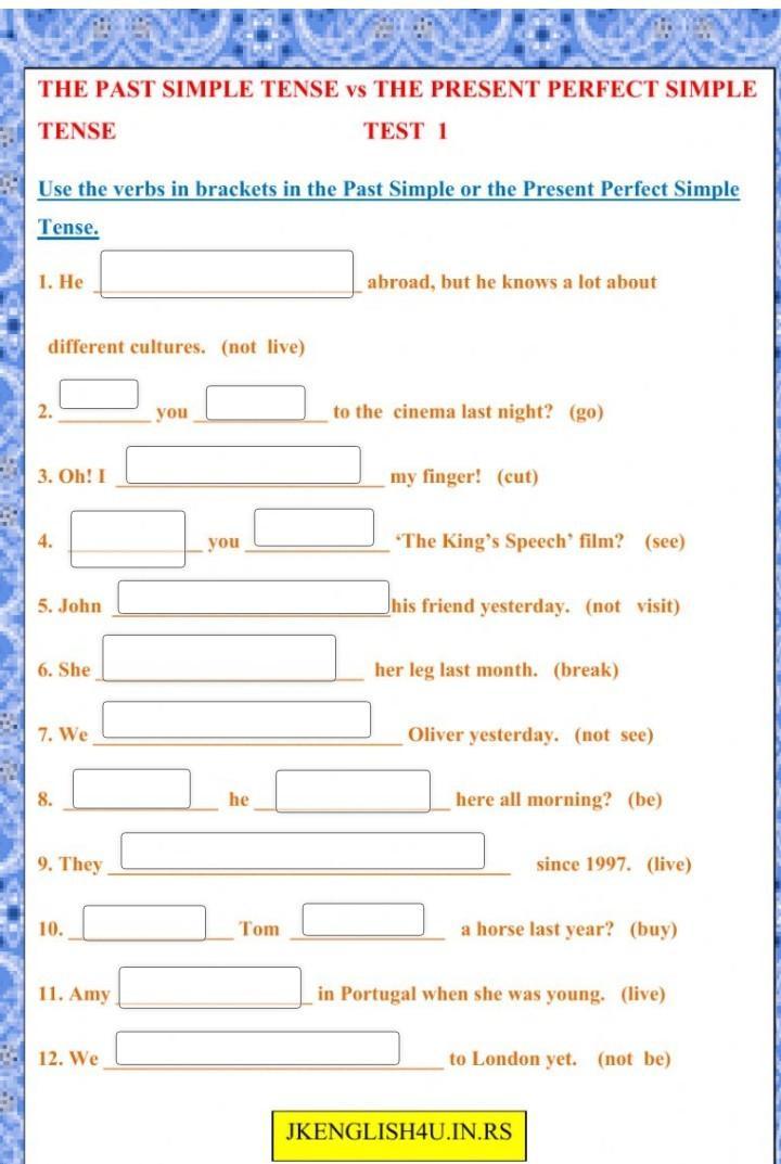 1) hasn’t lived 2) did you go 3) cut 4) have you seen 5) didn’t visit 6) broke 7) didn’t see 8) has he been 9) have lived 10) did Tom buy 11) lived 12) have not been
