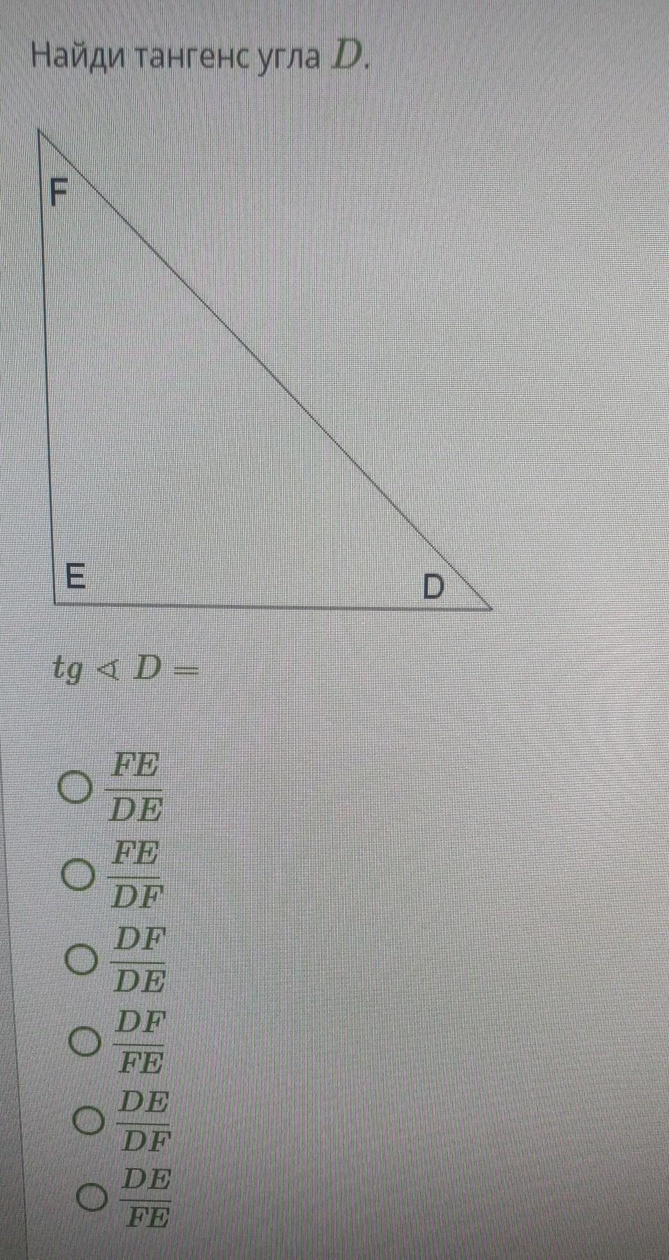 Тангенс-это отношение противолежащего катета к прилежащему. tg<D=FE/DE
