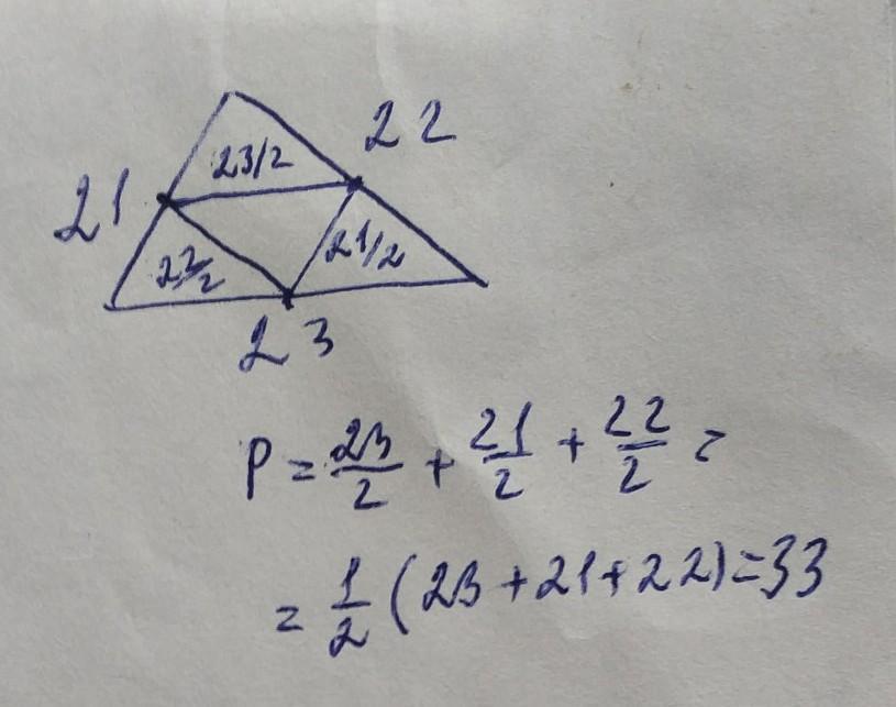В треугольнике стороны равны 21см, 22см,23 см. Найти периметр треугольника, образованного средними линиями данного треугольника