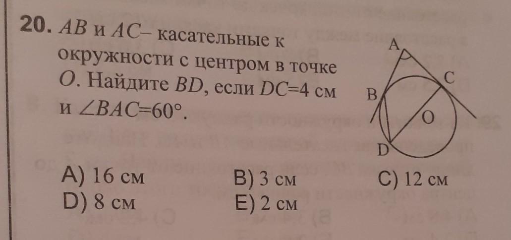 Дуга ВС=60×2=120°...т.е. угол ВDC=60°...DBC=90°Прямой угол,угол С =30°(сторона лежащая против прям. угла=1/2гипотенузы)DC-гипотенуза,т.е.BD=2 см