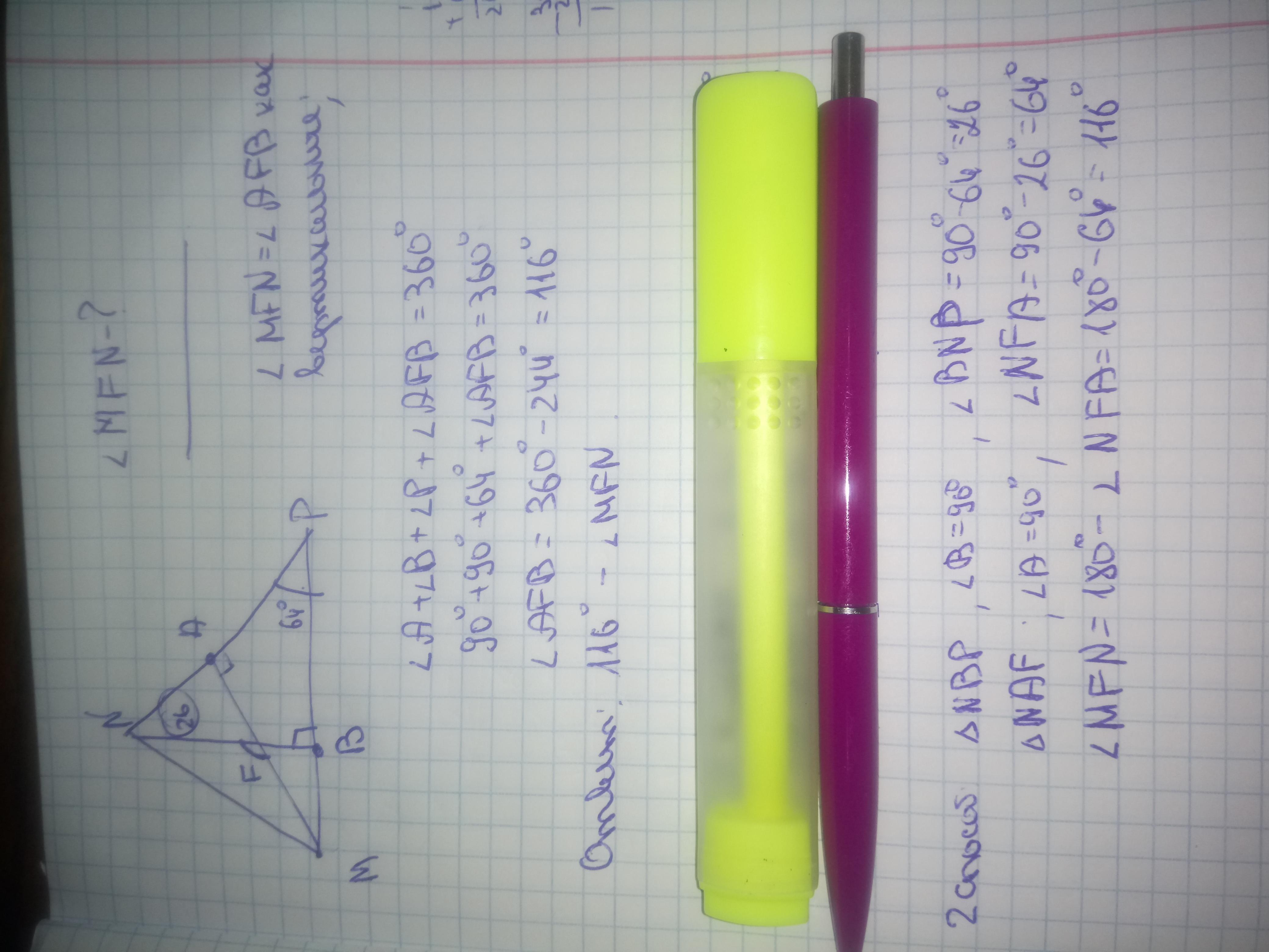 Высоты остроугольного треугольника MNP, проведенные из вершин M и N, пересекаются в точке F. Угол P=64∘. Найдите угол MFN.