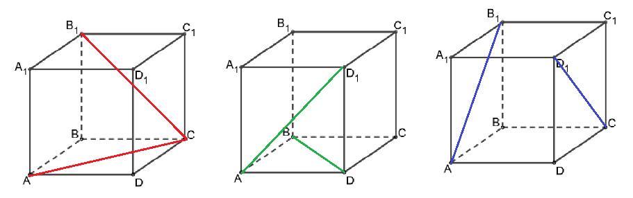 3. Определи угол между диагоналями, которые находятся в противоположных гранях куба, но не параллельны, например: