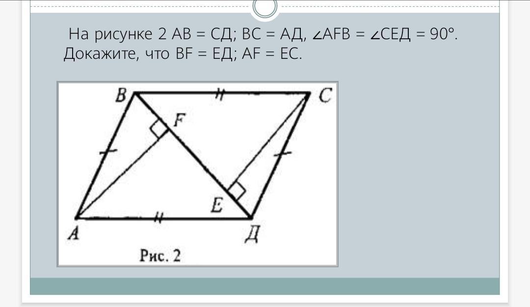 3)ΔАВF=ΔСДЕ как прямоугольные по гипотенузе и остроиу углу: