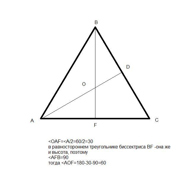 В равностороннем треугольнике ABC проведены биссектисы AD и BF, которые пересекаются в точке О. Тогда углы треугольника AOF будут равны