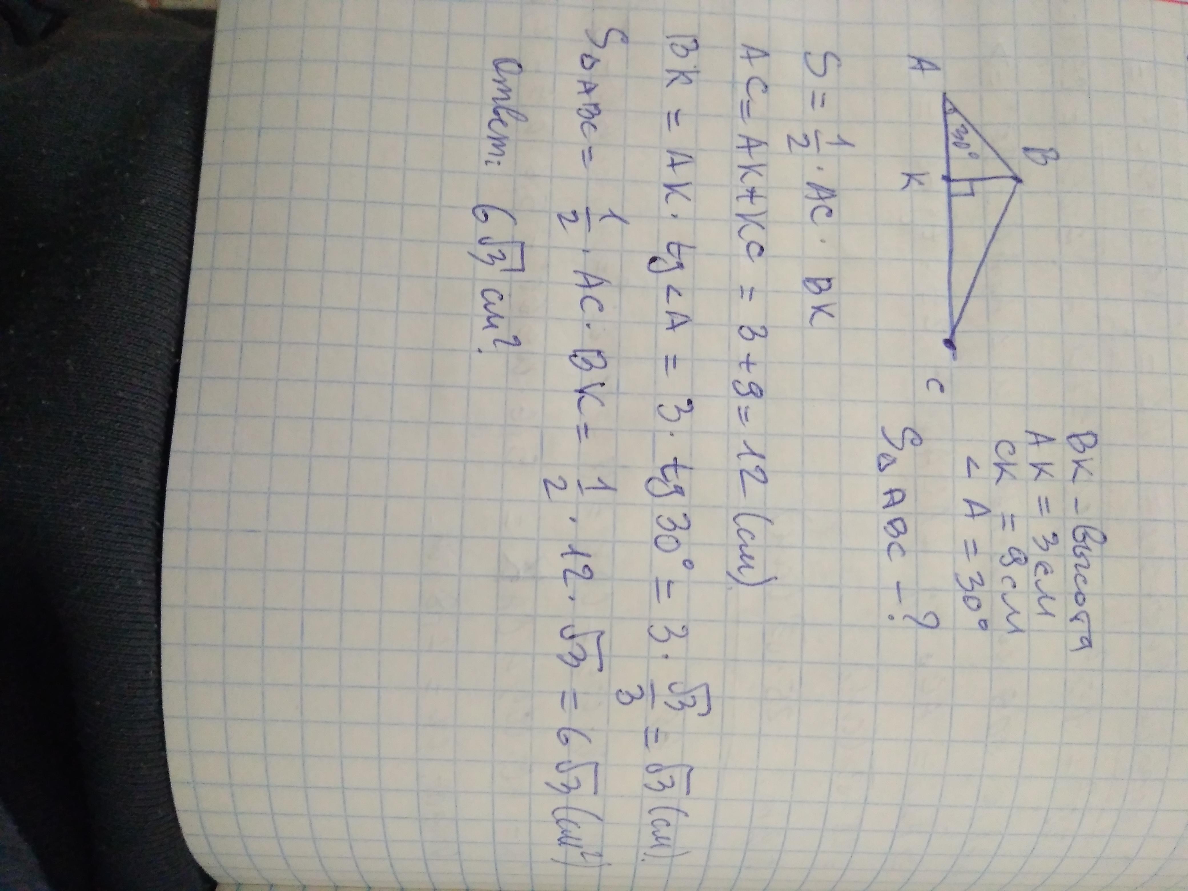 В треугольнике ABC высота BK делит сторону AC на отрезки AK и CK соответственно равные 3 см и 9 см. Найдите площадь треугольника ABC, если угол A=30 градусов