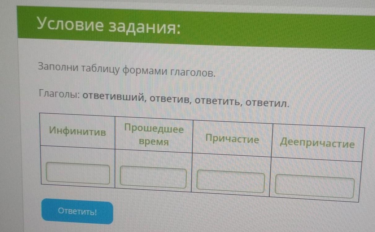 Инф-ответить. Прош.- ответил. Прич.- ответивший. дееприч.-ответив