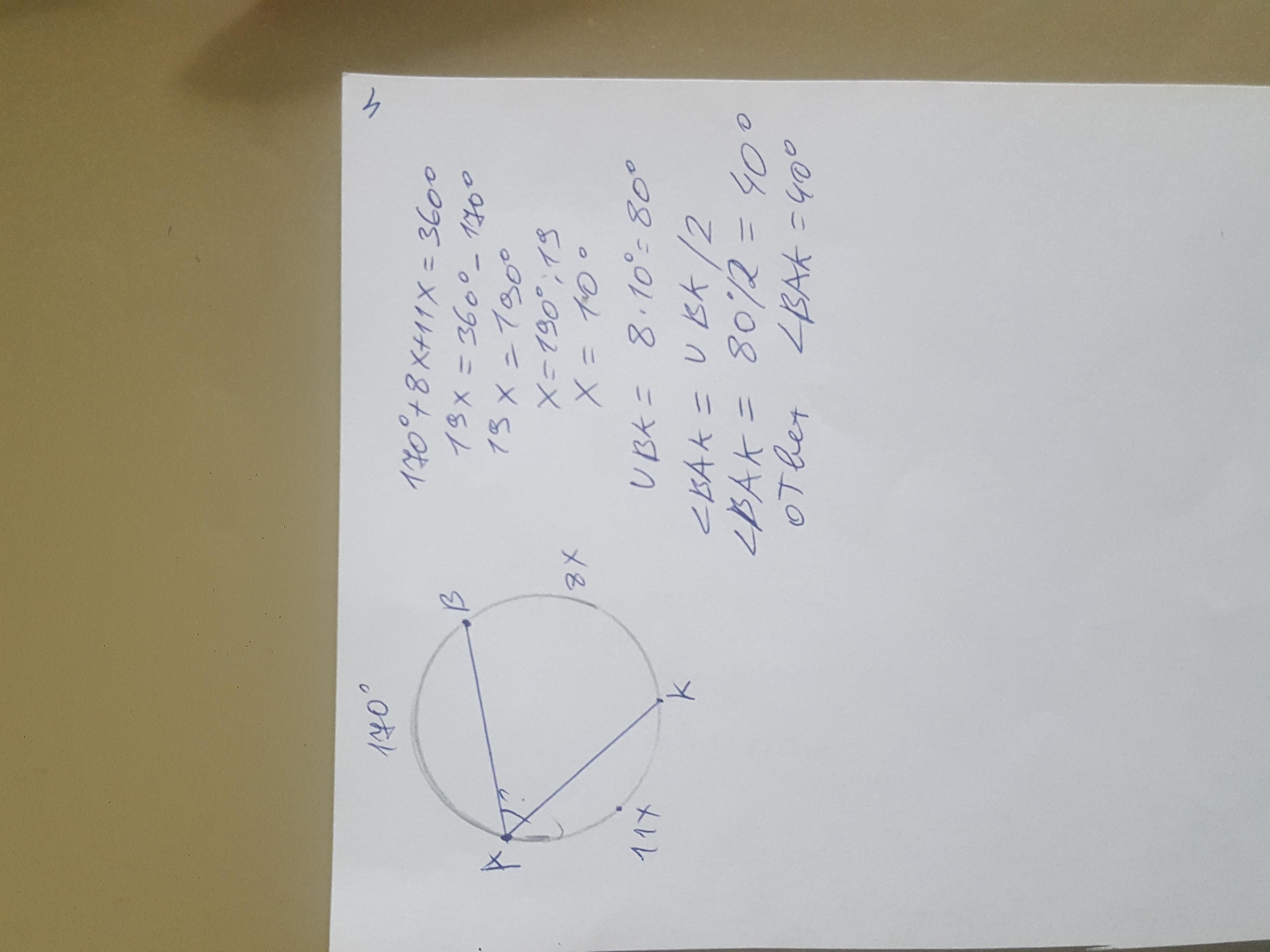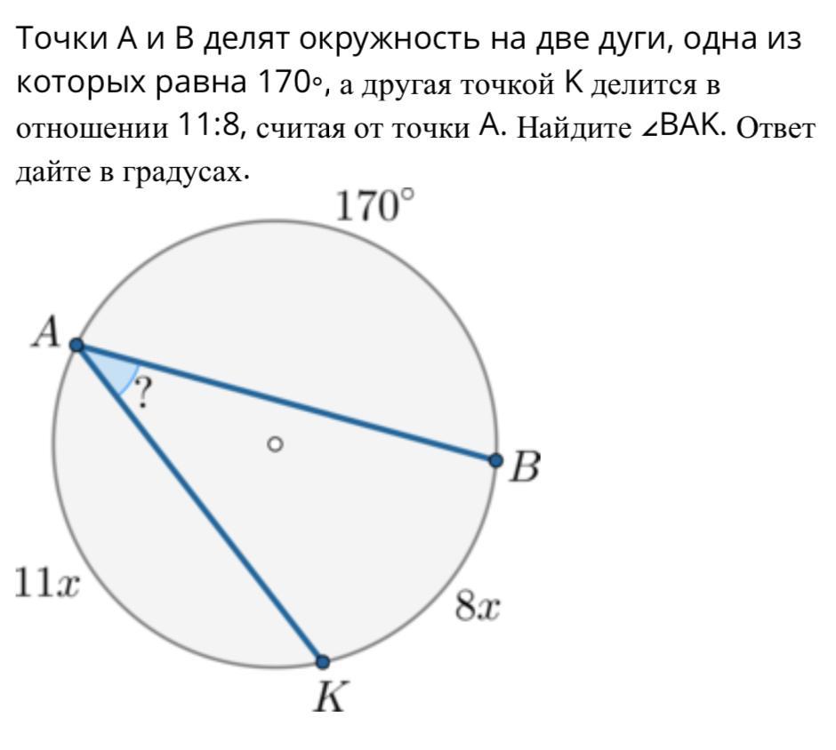 Точки A и B делят окружность на две дуги, одна из которых равна 170∘, а другая точкой K делится в отношении 11:8, считая от точки A. Найдите ∠BAK. Ответ дайте в градусах.