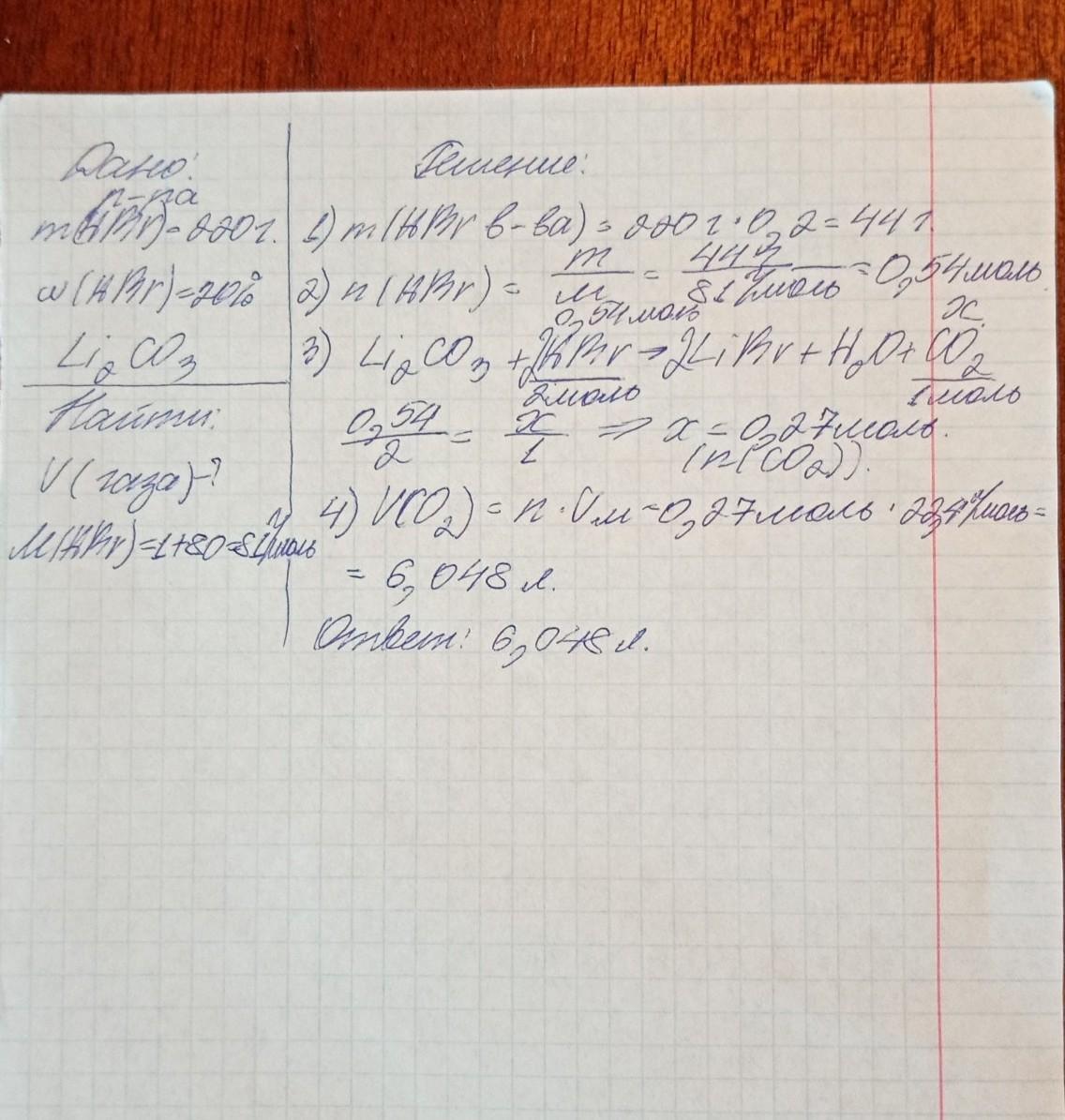 К раствору карбоната лития прилили раствор бромоводородной кислоты массой 220 г с массовой долей растворенного вещества 20%. Найдите объем выделившегося газа.