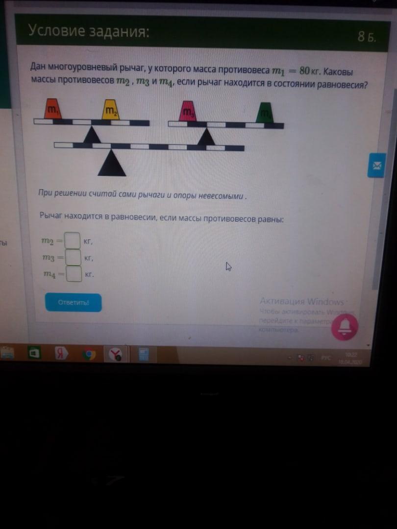Дан многоуровневый рычаг, у которого масса противовеса m1=80кг. Каковы массы противовесов m2 , m3 и m4, если рычаг находится в состоянии равновесия?
