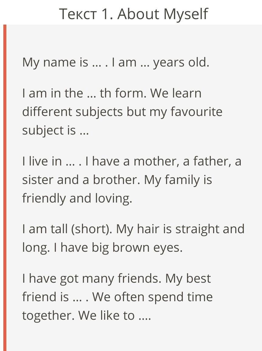 I am (пишешь какая ты по росту((tall-высокая,short-низенькая)). My hair is straight and long. I have big brown eyes.