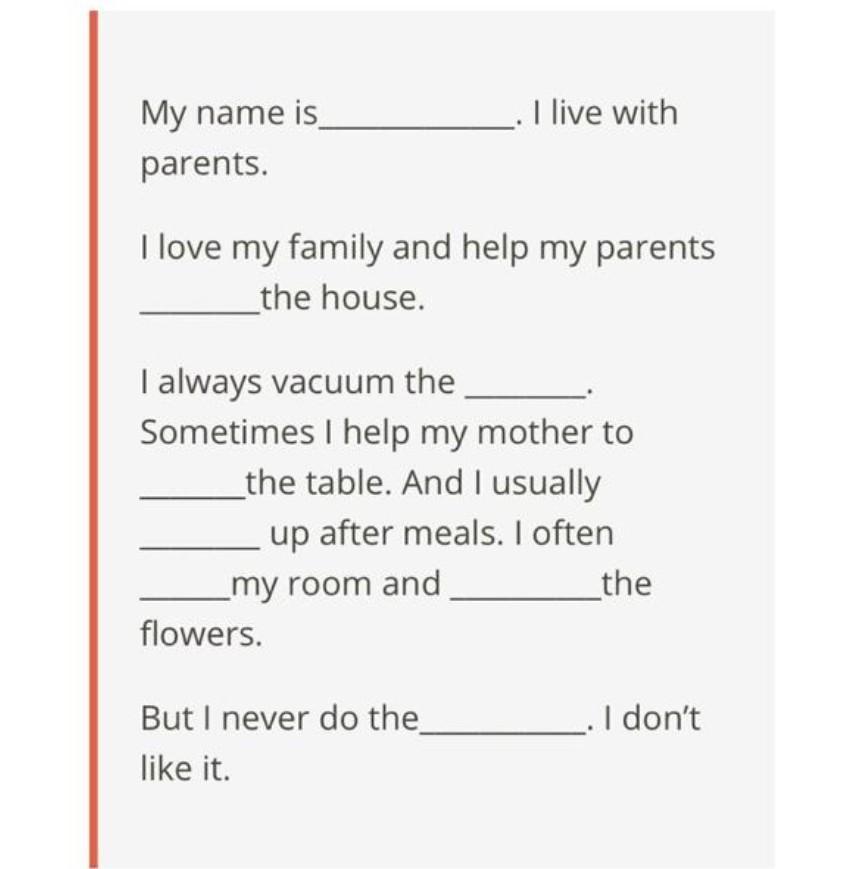 I always vacuum the rooms. Sometimes I help my mother to lay the table. And I usually clean up after meals. I often clean my room and water the flowers.