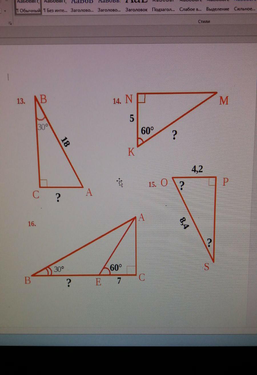 15. Здесь катет ОР в два раза меньше гипотенузы ОS. Значит угол, противолежащий катету, равен 30 градусов (угол ОSР). Следовательно, другой неизвестный угол будет равен 90-30=60 градусов.