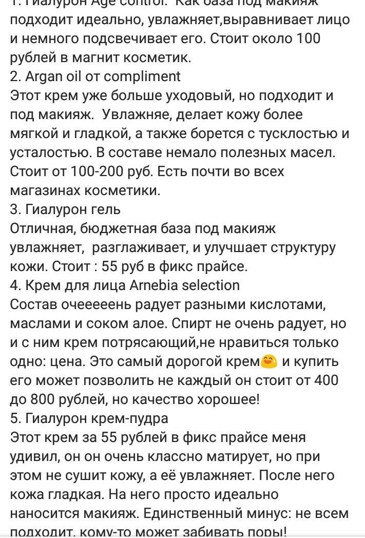 1. Гиалурон Age Control. Как база под макияж подходит идеально, увлажняет, выравнивает лицо и немного подсвечивает его. Стоит около 100 рублей в Магнит косметик.