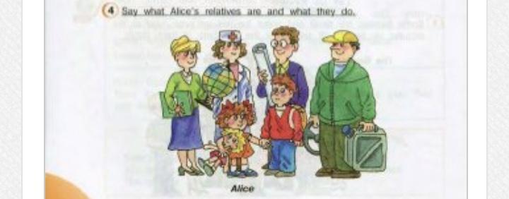 Her mother is a doctor. Alice father is an engineer. Her older brother is a student. Alice grandmother is a teacher, and her grandfather is a mechanic.