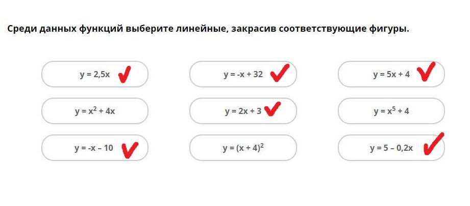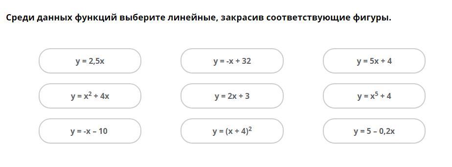 Линейными функциями являют функции вида y=kx+b, где "k" и "b" - некоторые числа. Другими словами функции, которые на графике "рисуют" прямую линию. Ну или другими словами те, у которых x находится в первой степени. Надеюсь, я понятно объяснил, чтобы ты понял, как выполнять задание, потому что оно само не трудное))