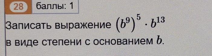(b⁹)⁵*b¹³=b⁽⁹*⁵⁾*b¹³=b⁴⁵*b¹³=b⁽⁴⁵⁺¹³⁾=b⁵⁸.