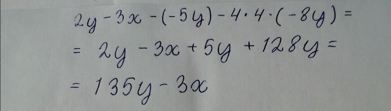 Приведи многочлен К стандартному виду: 2y - 3х - (- 5y) — 4x4 . (- 8y)
